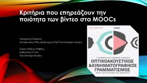 • Αλιβίζος (Λοΐζος) Σοφός, Στέφανος Γιασιράνης: Κριτήρια που επηρεάζουν την ποιότητα των βίντεο στα MOOCs.