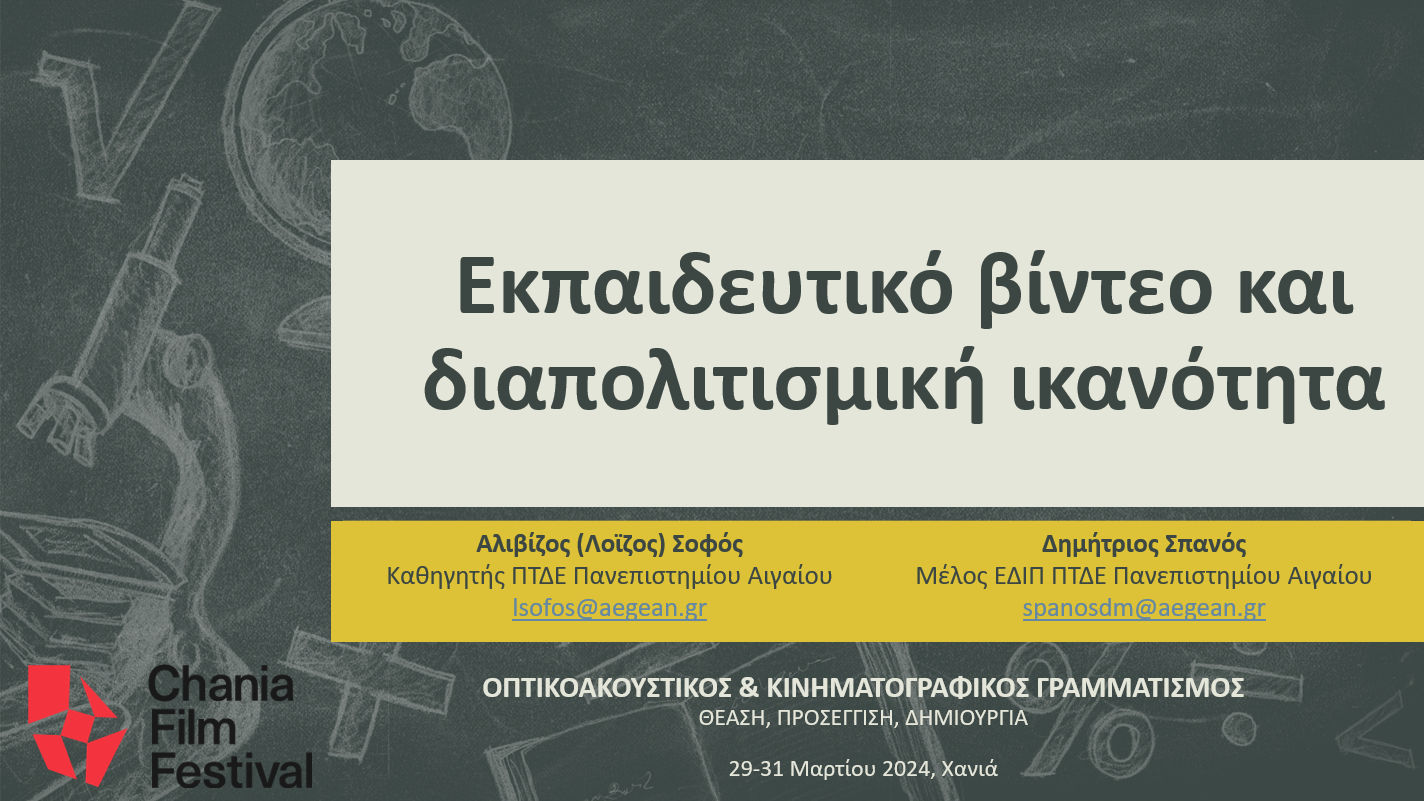 Η ομάδα Media Pedagogy Research Group του Παιδαγωγικού Τμήματος Δημοτικής Εκπαίδευσης του Πανεπιστημίου Αιγαίου συμμετείχε με τρεις διδάκτορες της ομάδας έρευνάς της, τη Σοφία Παπαδημητρίου (Μεταδιδακτόρισσα του ΠΤΔΕ) Προϊστάμενη στην Εκπαιδευτική Ραδιοτηλεόραση, τον Στέφανο Γιασιράνης υποψήφιο Μεταδιδάκτορα και τον Δημήτρη Σπανό μέλος ΕΔΙΠ στο 1ο Διεθνές Επιστημονικό Συνέδριο με τίτλο Οπτικοακουστικός & Κινηματογραφικός Γραμματισμός. που οργάνωσε ο Ματθαίος Φραντζεσκάκης με την ομάδας εργασίας του στην θαυμάσια πόλη των Χανίων με τις ακόλουθες εισηγήσεις που στήριξαν ουσιαστικά τη θεματική εστίαση του Συνεδρίου: